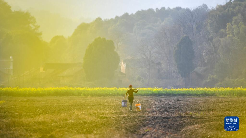 2月27日、湖南省常寧市西嶺鎮西沖村の畑で肥料を運ぶ農家の人。(常寧=新華社配信/周秀魚春)pagebreak
