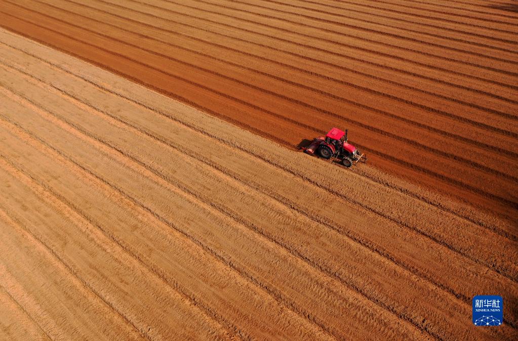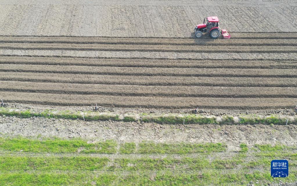 2月27日、江西省吉安市泰和県沿渓鎮草坪村の畑を整地する大型トラクター。(小型無人機から、吉安=新華社配信/鄧和平)pagebreak