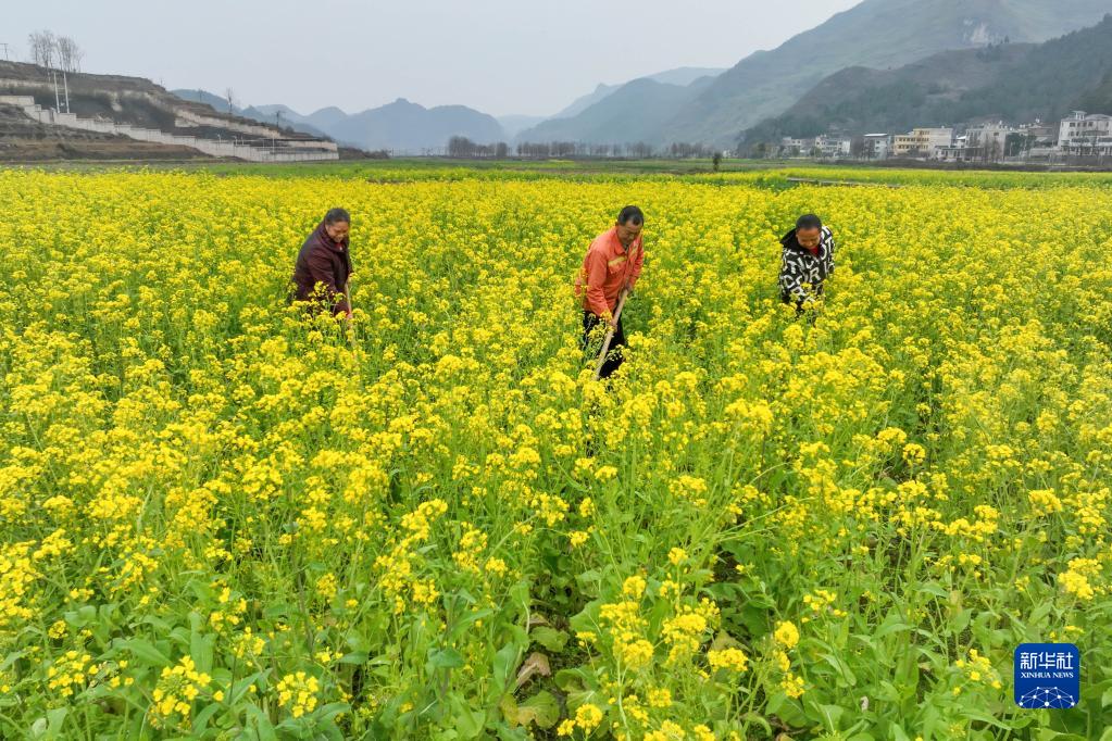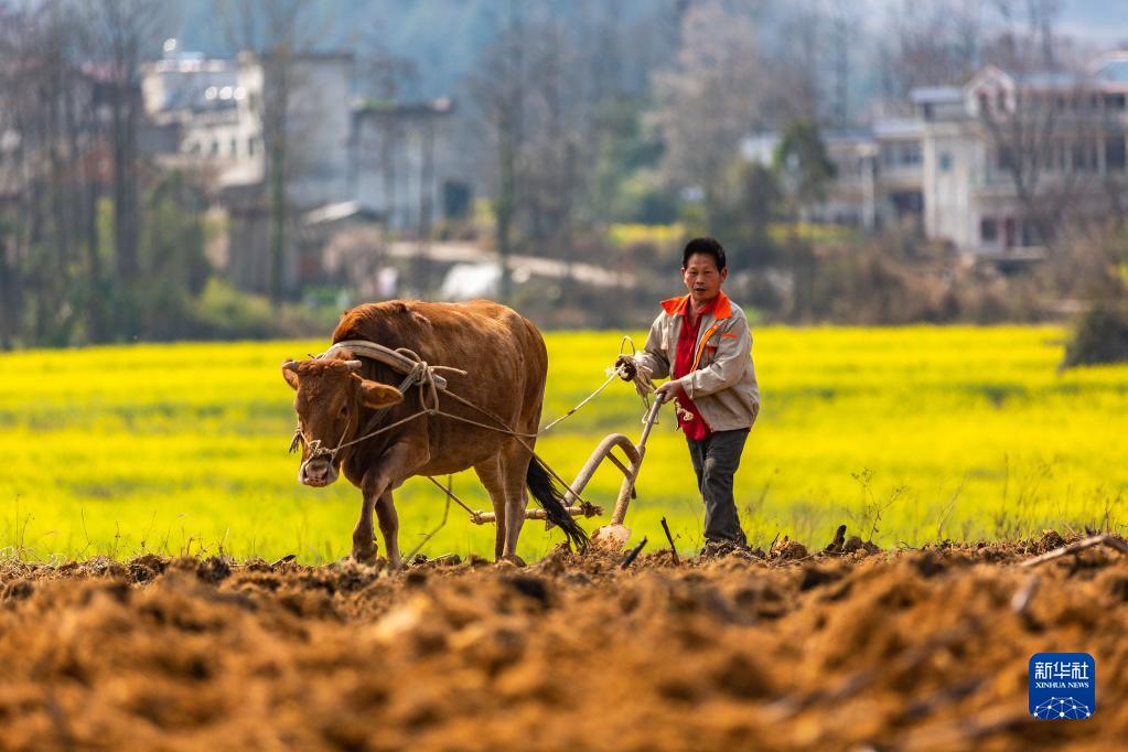 2月27日、貴州省安順市西秀区鶏場プイ族ミャオ族郷の畑を耕す農家の人。(安順=新華社配信/陳熙)pagebreak
