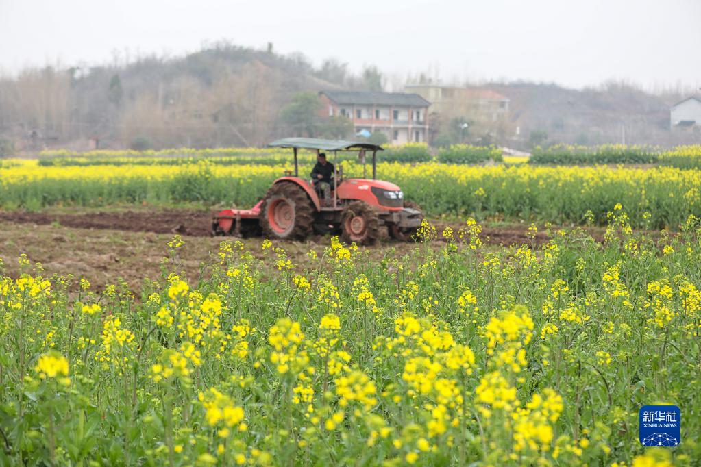 2月28日、湖南省衡陽市峴山鎮更栄村の畑で農機を使って畑を耕す人。(衡陽=新華社配信/劉欣栄)