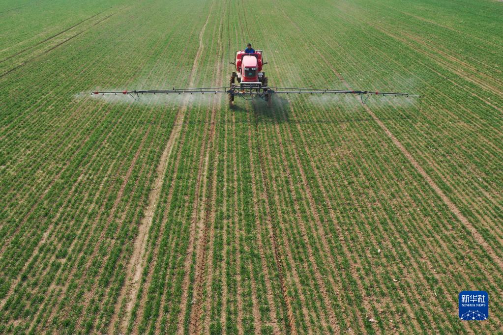 2月27日、河南省焦作市温県の小麦畑で肥料を散布する農家の人。(小型無人機から、焦作=新華社配信/徐宏星)pagebreak