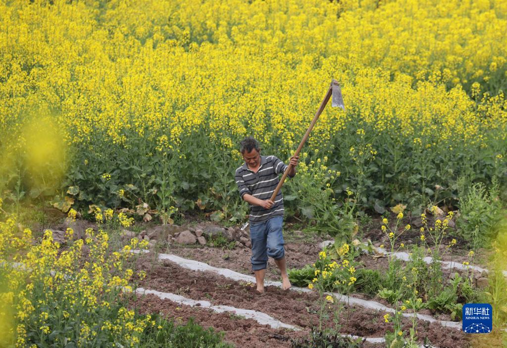 2月27日、貴州省赤水市文華街道の畑でくわを振るう農家の人。(赤水=新華社配信/王長育)