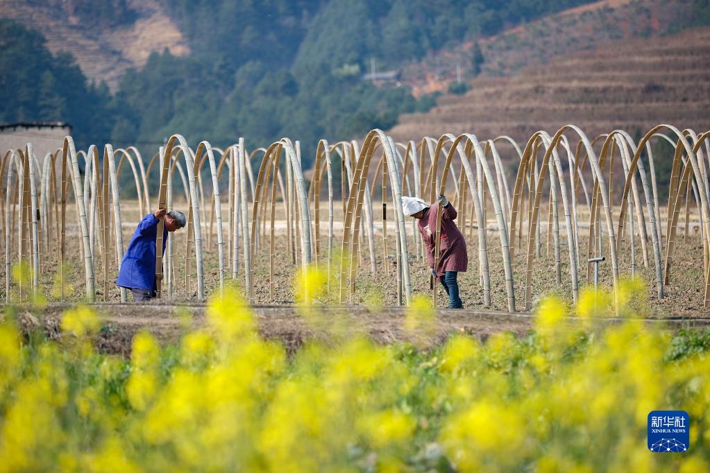 2月27日、貴州省黔東南(けんとうなん)ミャオ族トン族自治州丹寨県興仁鎮城江村の畑でスイカ用の棚を作る農家の人。(丹寨=新華社配信/黄暁海)pagebreak
