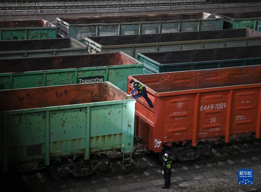 出入国する列車を検査する崔洪武さん(上)と同僚。(4月4日撮影、阿拉山口=新華社記者/李響)pagebreak