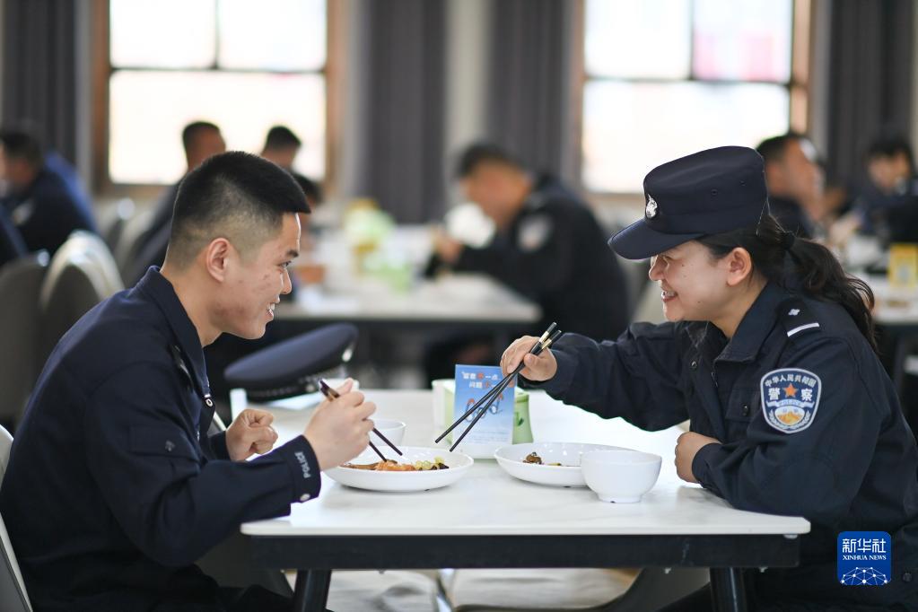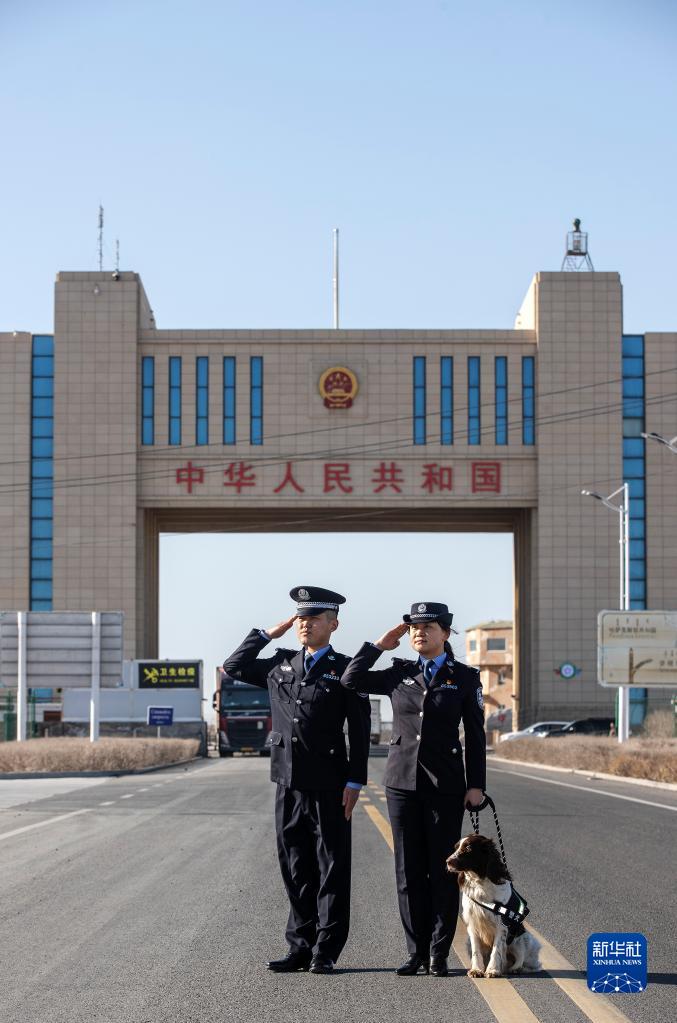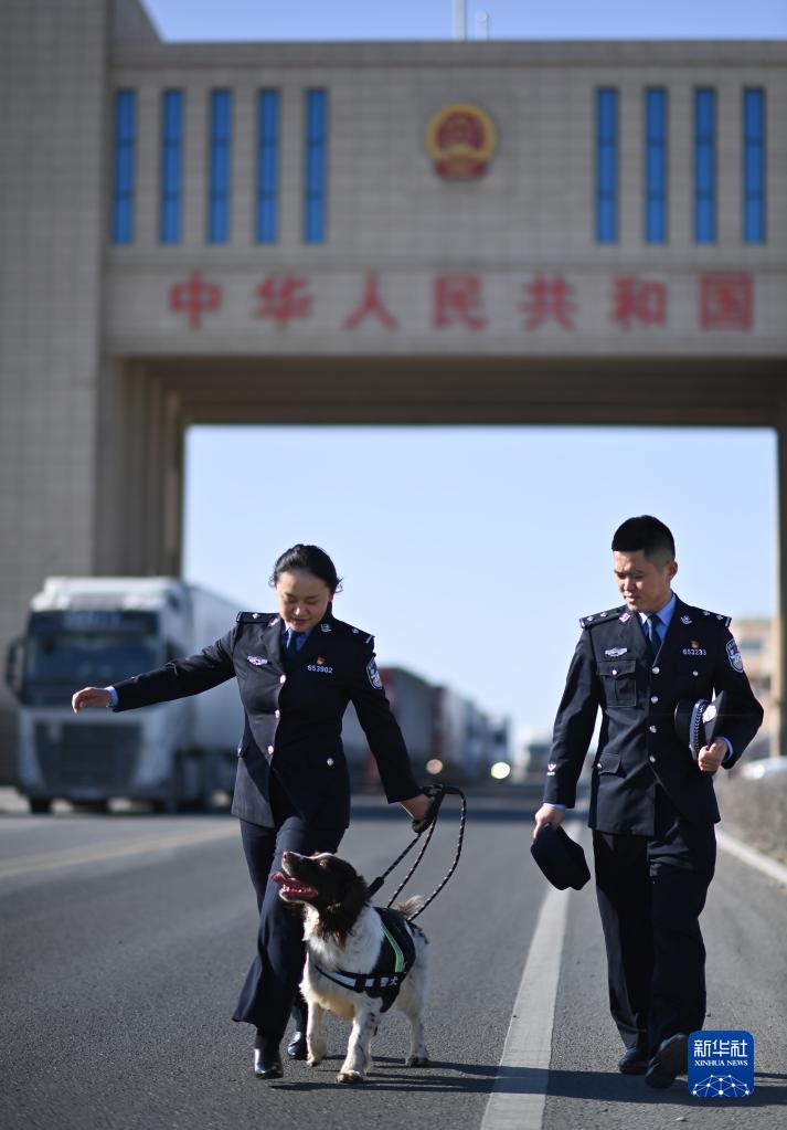 崔洪武(さい・こうぶ)さんは、「風口国門の衛士」と呼ばれる同ステーションの警官の一人。2013年に故郷の山東省浜州市で入隊し、阿拉山口口岸に配属された。妻の劉欣(りゅう・きん)さんと出会ったのも同口岸だった。劉さんは17年に学校を卒業後、入隊を志願し、19年に阿拉山口にやって来た。2人は20年4月に結婚。半年後には警察犬の康欣(カンシン)も家族の一員になり、劉さんは訓練を経て、同年10月に新疆出入境検査総合ステーション初の女性警察犬訓練士の1人となった。pagebreak