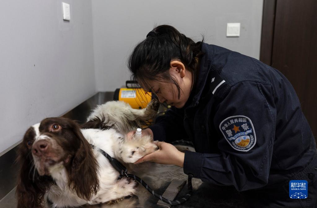 警察犬、康欣の足の傷口に薬を塗る劉欣さん。(4月3日撮影、阿拉山口=新華社記者/費茂華)pagebreak