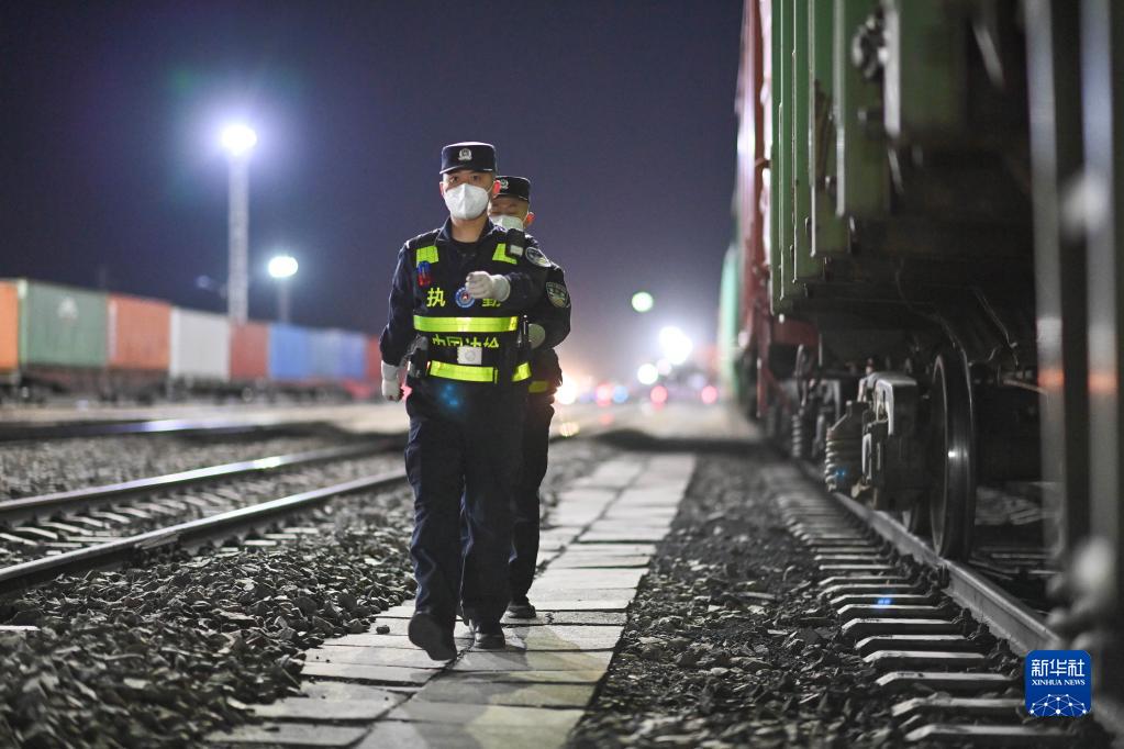 出入国する列車を検査する崔洪武さん(左)と同僚。(4月4日撮影、阿拉山口=新華社記者/費茂華)pagebreak