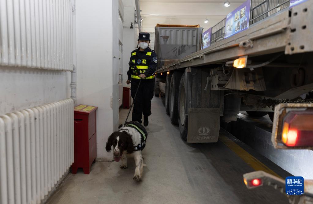 警察犬の康欣を連れて車両を検査する劉欣さん。(4月4日撮影、阿拉山口=新華社記者/費茂華)pagebreak