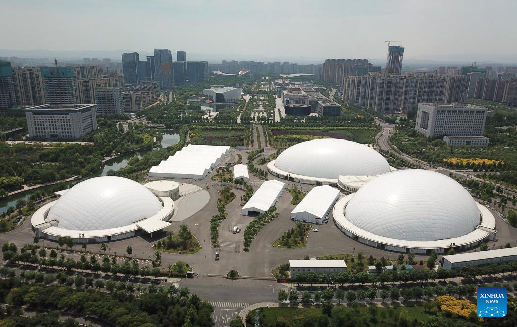 8日、淄博市張店区にある淄博コンベンション・エキシビションセンター。(小型無人機から、淄博=新華社記者/徐速絵)pagebreak