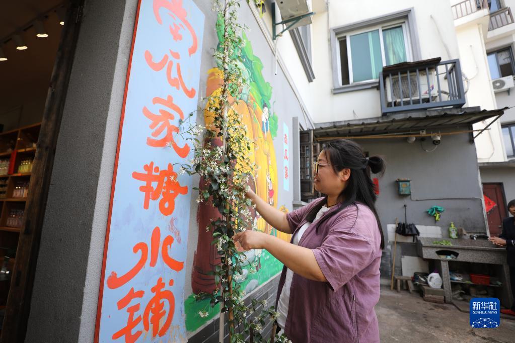 23日、浙江省義烏市李祖村にあるカボチャの汁粉を提供する「南瓜家糖水店」の中庭で植物の手入れをするるオーナーの封玲(ふう・れい)さん。(義烏=新華社記者/杜瀟逸)pagebreak