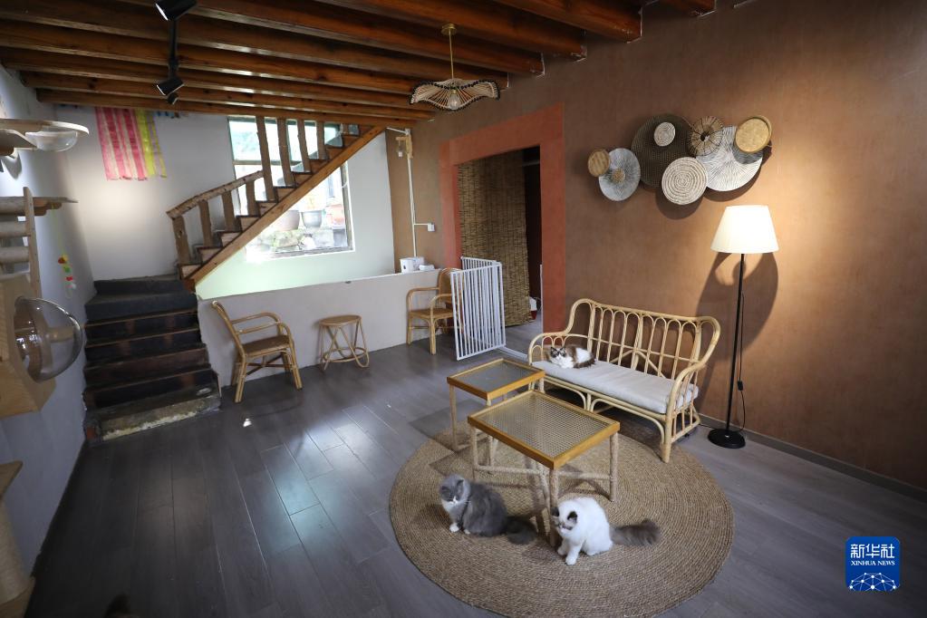 23日、浙江省義烏市李祖村にある猫カフェ「猫的小院」の店内。(義烏=新華社記者/杜瀟逸)
