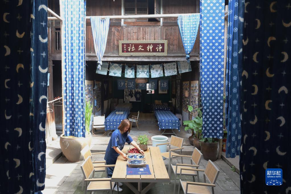 23日、浙江省義烏市李祖村にある染色工房「沙漠的染坊」でテーブルを整えるオーナーの母親。(義烏=新華社記者/杜瀟逸)pagebreak