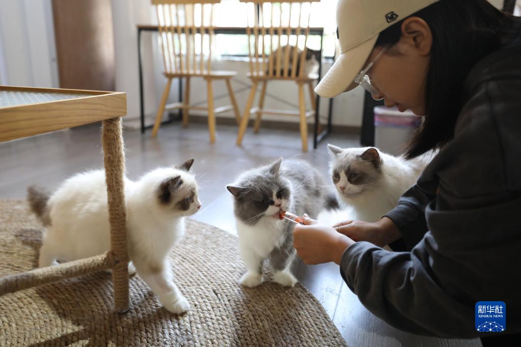23日、浙江省義烏市李祖村の猫カフェ「猫的小院」で開店前に猫にえさをやる店長。(義烏=新華社記者/杜瀟逸)pagebreak