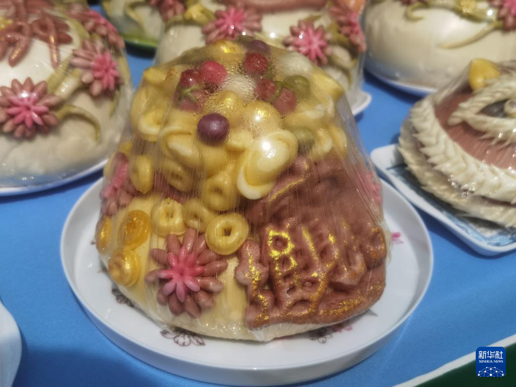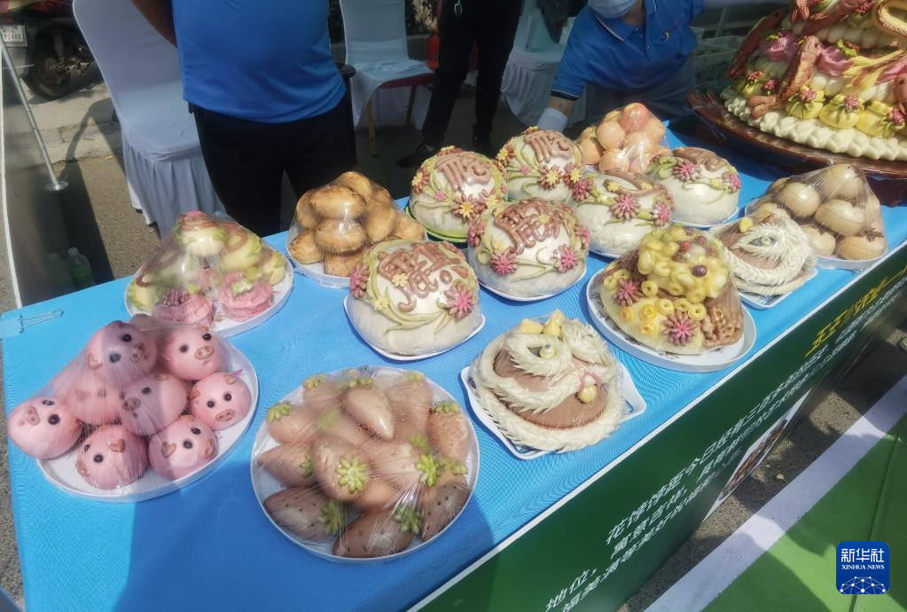 26日、会場で展示された青島百業日新農産物栽培専門合作社(協同組合)の「花餑餑」。「花餑餑」は小麦粉を使った伝統的な蒸し菓子で、山東省の無形文化遺産に登録されている。(膠州=新華社記者/王凱)