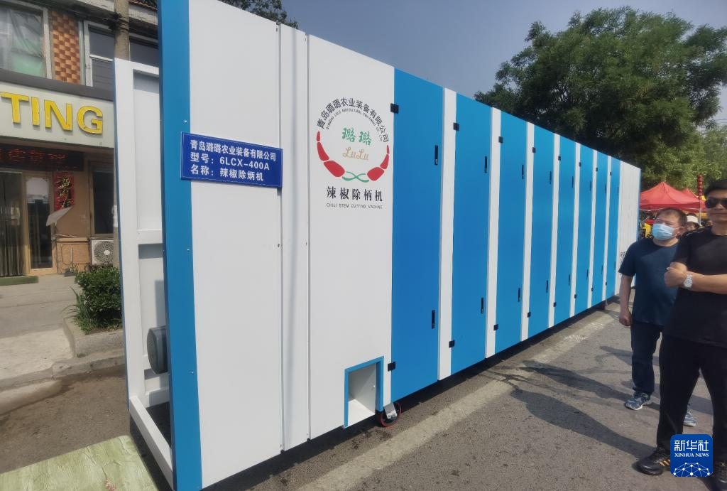 26日、会場で展示された青島璐璐農業装備のトウガラシのさや取り機。(膠州=新華社記者/王凱)pagebreak