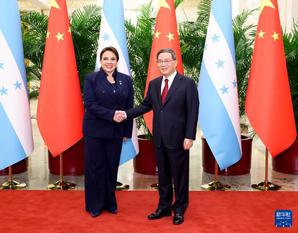 中国の李強(り・きょう)国務院総理は13日午前、中国を国賓として訪問しているホンジュラスのカストロ大統領と北京の人民大会堂で会見した。(北京=新華社記者/劉彬)