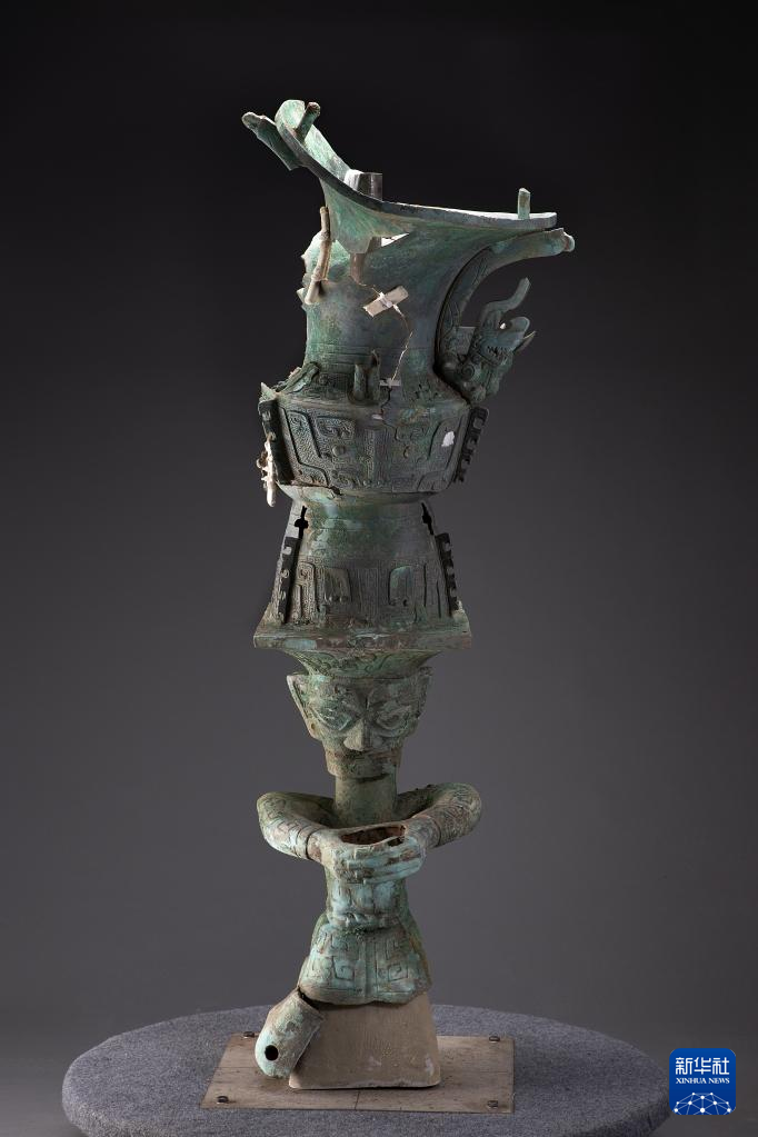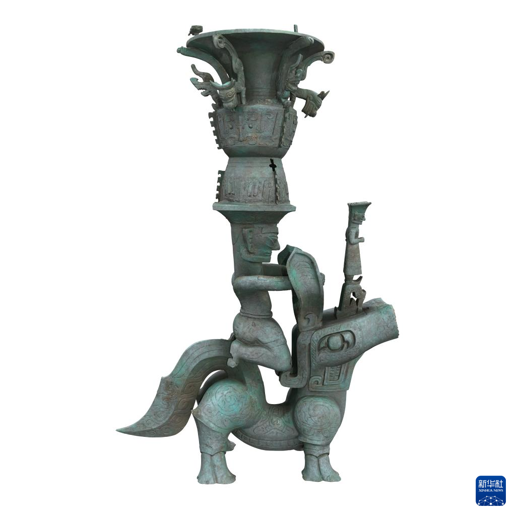 復元された青銅器は「銅獣馱跪座人頂尊銅像(どうじゅうたきざじんちょうそんどうぞう)」と「銅罍座倒立鳥足頂尊神像(どうらいざとうりつちょうそくちょうそんしんぞう)」。いずれも異なる祭祀坑(さいしこう)で出土した部位を組み合わせて作り上げた。安全性の問題で原物を組み立てることはできないため、3Dスキャンや3Dモデリングなどの技術を用いてモニター上で復元した。pagebreak