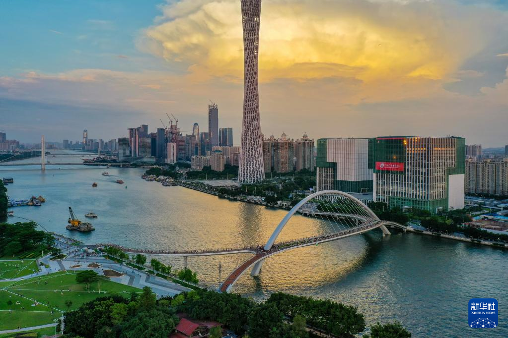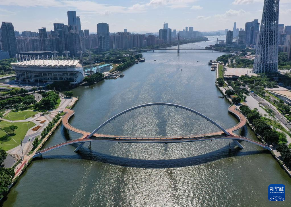 広州市の海心橋と周辺の景色。(6月10日、小型無人機から、広州=新華社記者/劉大偉)