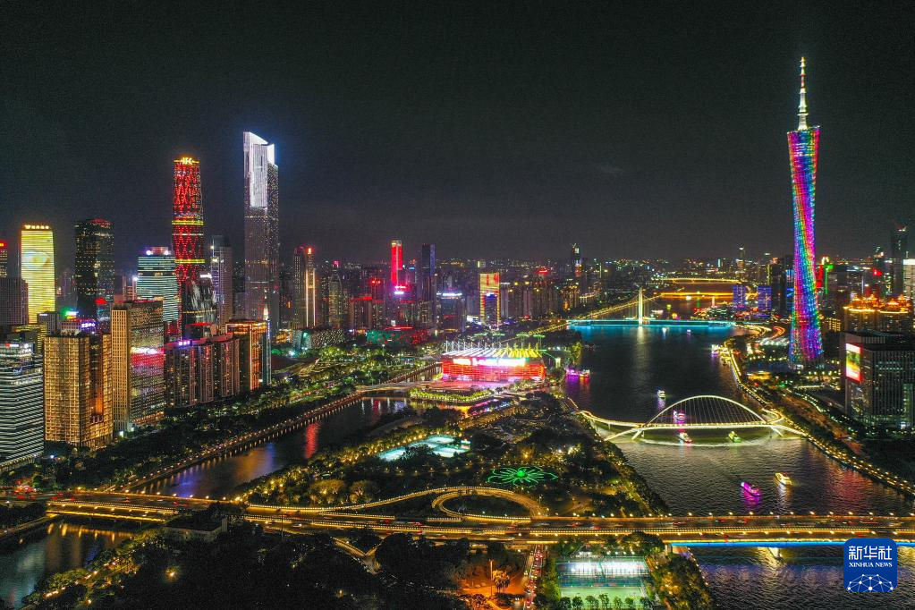 広州市の海心橋と周辺の景色。(2022年10月2日、小型無人機から、広州=新華社記者/劉大偉)pagebreak