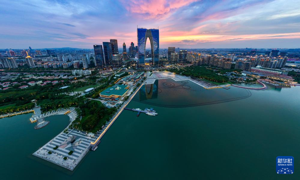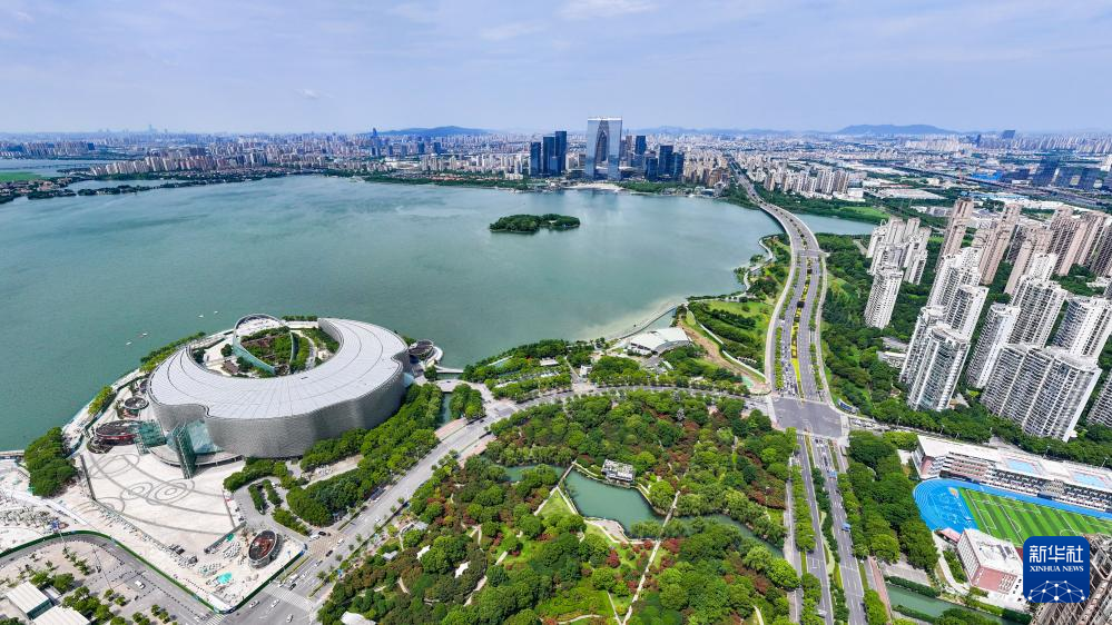 空から見た蘇州工業パークの金鶏湖畔。(7月4日、小型無人機から、蘇州=新華社記者/李博)pagebreak