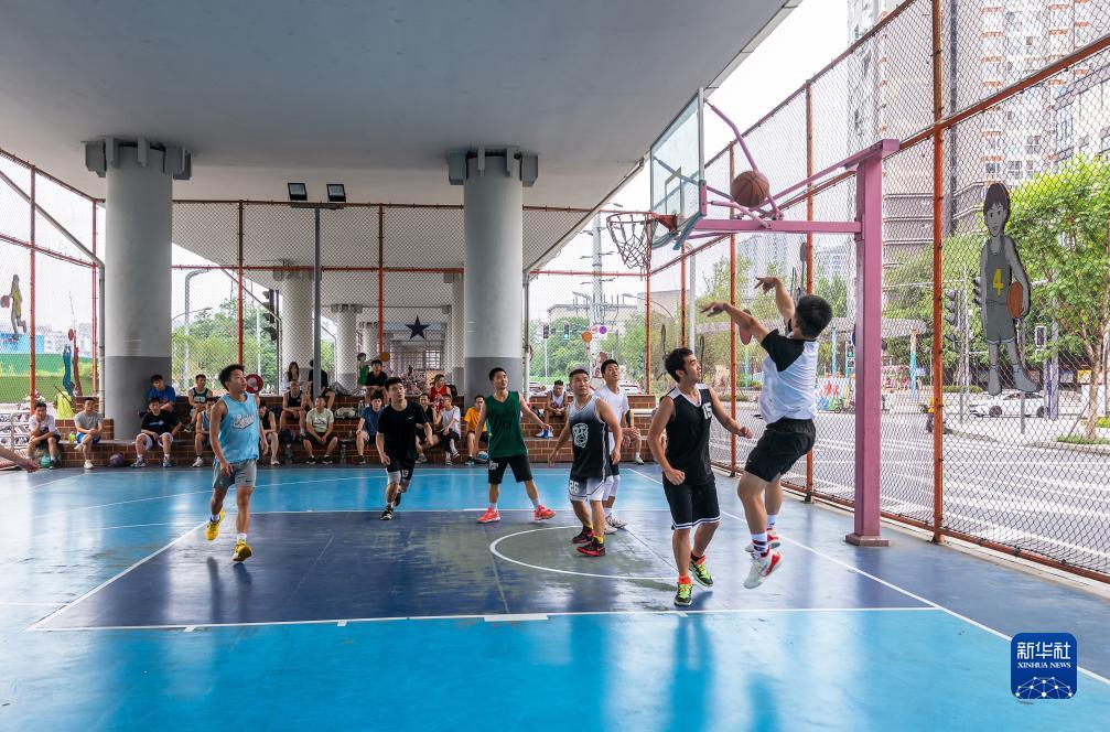 2022年6月12日、成都市の府青路立体交差橋の下にある運動スペースでバスケットボールをする人たち。(成都=新華社配信/杜寧)pagebreak
