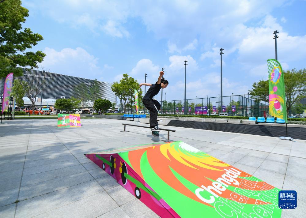 2023年4月19日、成都市の東安湖体育公園でスケートボードを練習する愛好家。(成都=新華社記者/王曦)