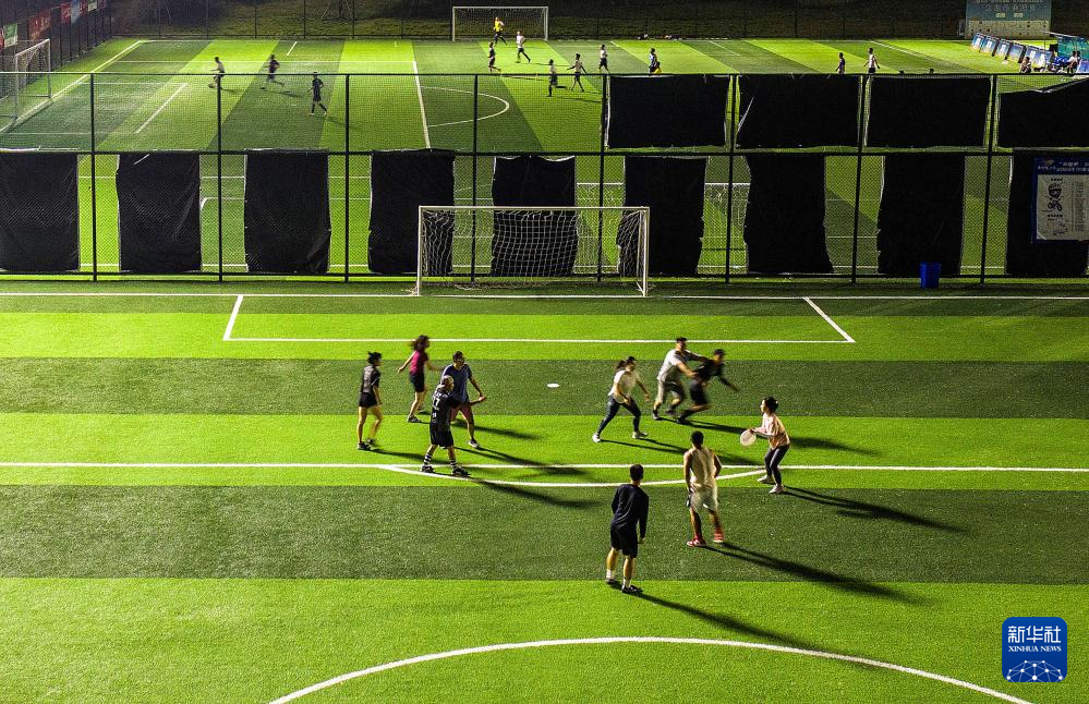 2023年7月13日、成都市錦江体育公園のサッカー場でフライングディスクを楽しむ市民。(成都=新華社記者/江宏景)pagebreak