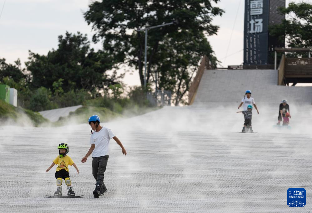 2023年7月18日、成都市の美洲時尚体育公園で、コーチの指導を受けてスノーボードを練習する子どもたち。(成都=新華社記者/江宏景)pagebreak