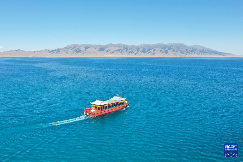 25日、観光客を乗せてサイラム湖を航行する遊覧船。(小型無人機から、ボルタラ=新華社記者/丁磊)