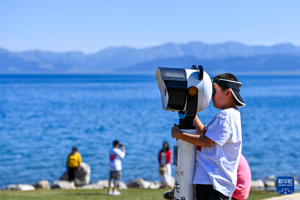 25日、サイラム湖風景区で望遠鏡を使って景色を眺める子ども。(ボルタラ=新華社記者/丁磊)pagebreak