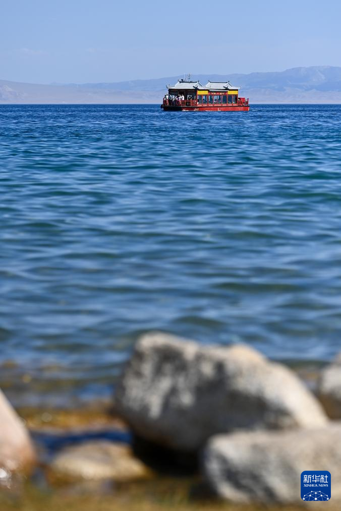 25日、観光客を乗せてサイラム湖を航行する遊覧船。(ボルタラ=新華社記者/丁磊)pagebreak