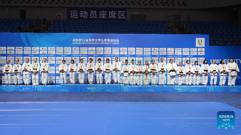 1日、柔道女子団体の表彰式。(成都=新華社記者/李欣)pagebreak