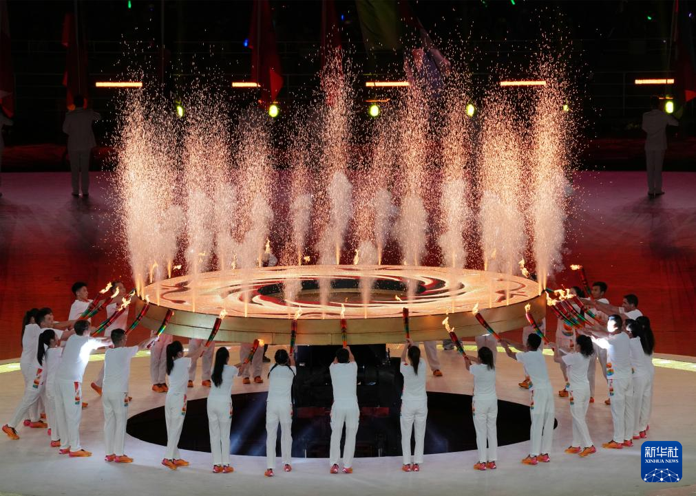 7月28日、開会式で点火される聖火台。(成都=新華社記者/李欣)
