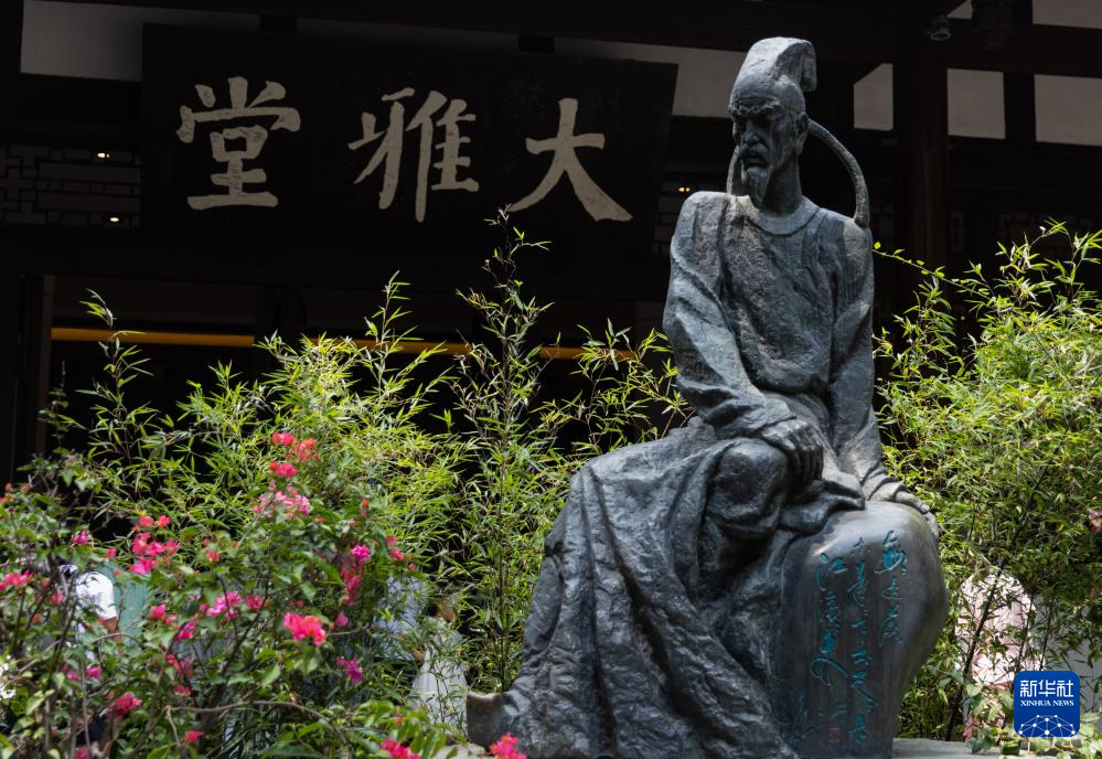 成都杜甫草堂の大雅堂前に立つ杜甫像。(7月19日、成都=新華社記者/江宏景)