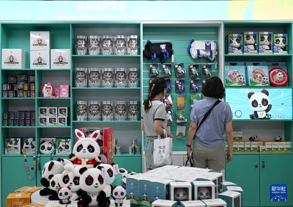 7月18日、成都市内の公式ライセンス商品ショップで商品を選ぶ市民。(成都=新華社配信/胥氷潔)