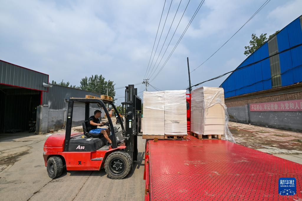 17日、天津市武清区黄花店鎮邵七堤村で、紙製品企業の生産に必要な物資を運ぶスタッフ。(天津=新華社記者/孫凡越)