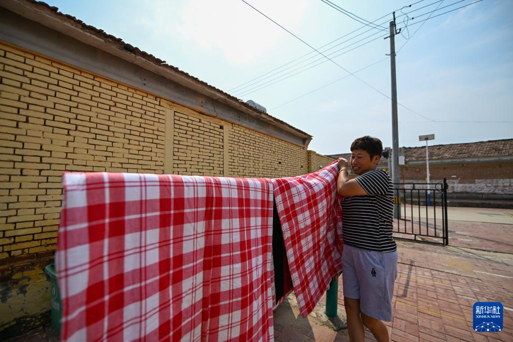 17日、天津市武清区黄花店鎮邵七堤村で、家に帰って布団を干す村民。(天津=新華社記者/孫凡越)pagebreak