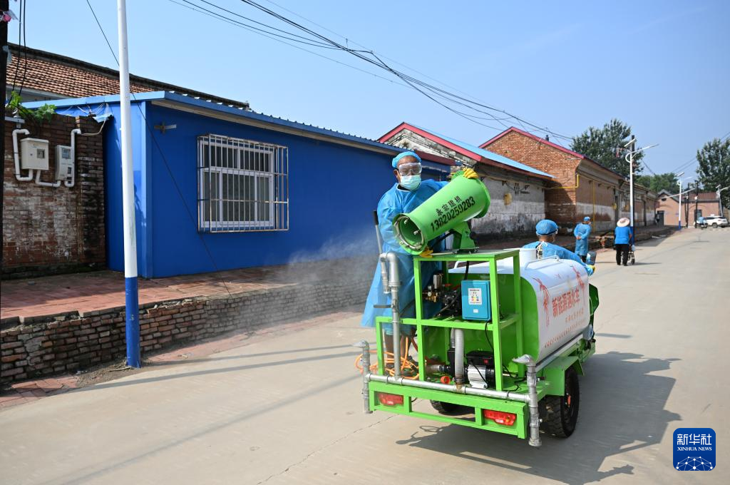17日、天津市武清区黄花店鎮邵七堤村で、消毒を行う作業員。(天津=新華社記者/孫凡越)pagebreak