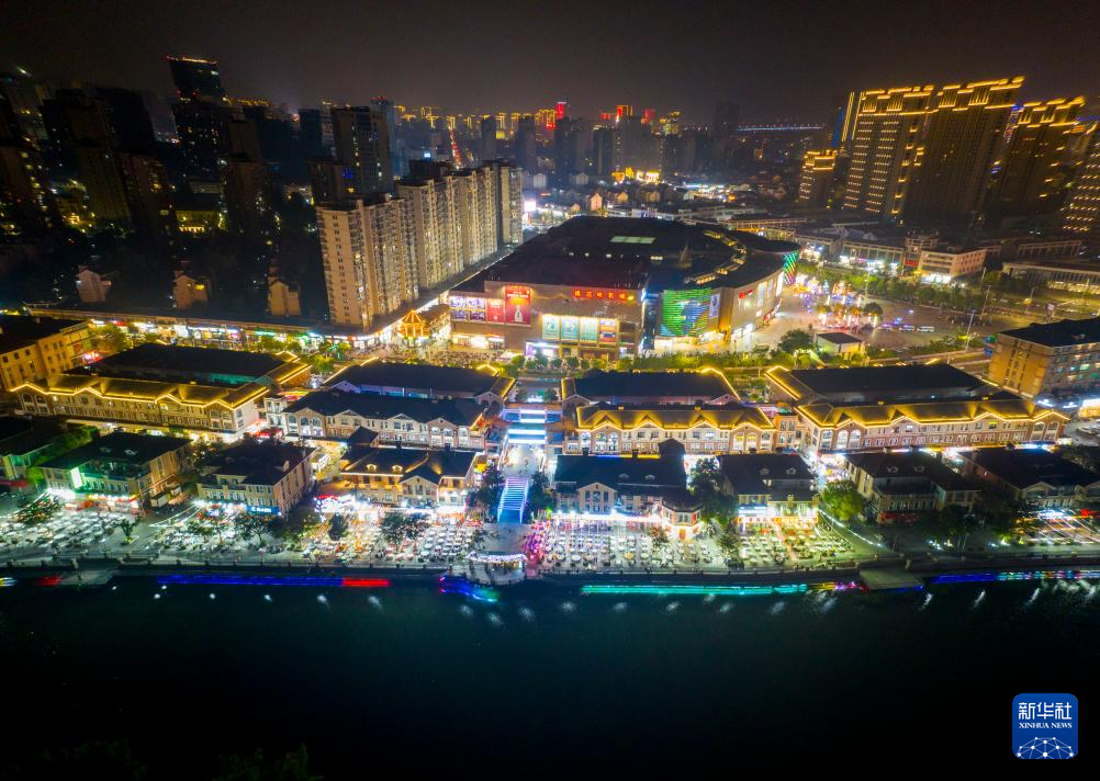 華やかな明かりがきらめく江蘇省宿遷市の「尋味宿遷不夜街」。(8月13日撮影、宿遷=新華社配信/王松竹)