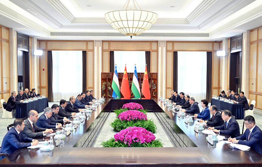 中国の李強(り・きょう)国務院総理は8日午後、第19回アジア競技大会(杭州アジア大会)閉会式出席のため訪中したウズベキスタンのアリポフ首相と浙江省杭州市で会談した。(杭州=新華社記者/殷博古)