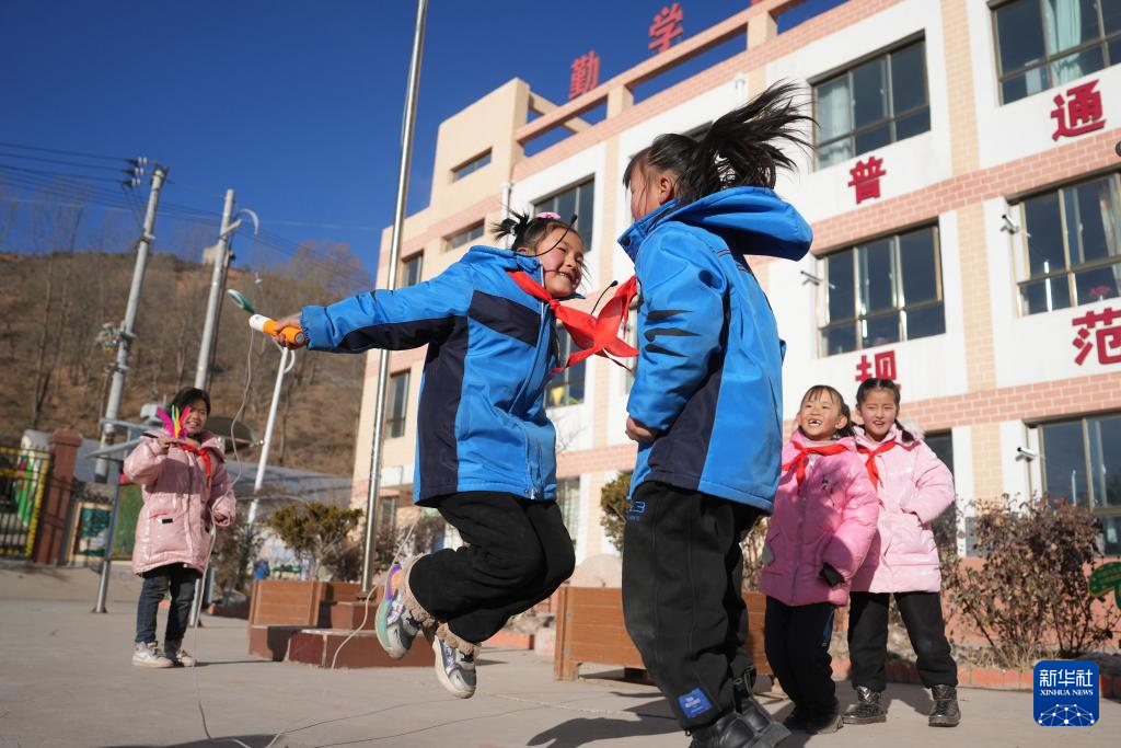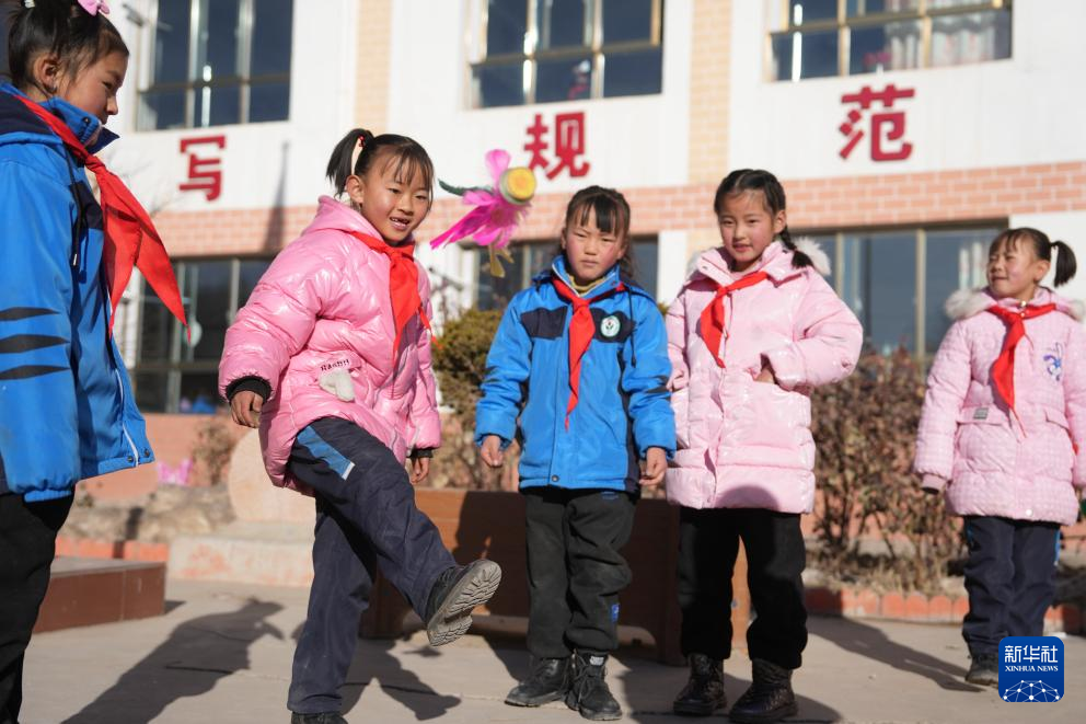 25日、積石山パオアン族トンシャン族サラール族自治県柳溝郷陽山希望小学校で休み時間に遊ぶ児童ら。(積石山=新華社記者/陳斌)