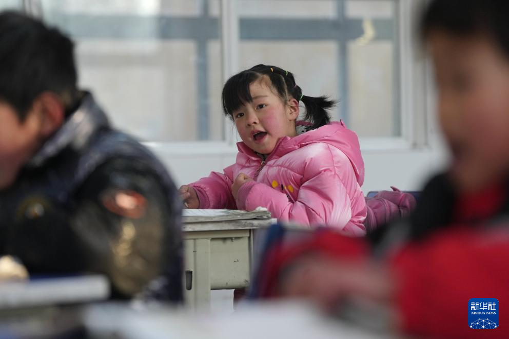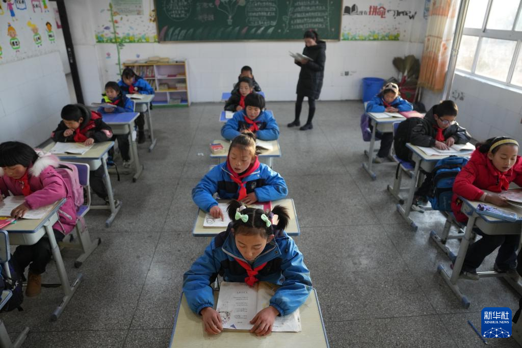 25日、積石山パオアン族トンシャン族サラール族自治県柳溝郷陽山希望小学校で国語の授業を受ける児童。(積石山=新華社記者/方欣)