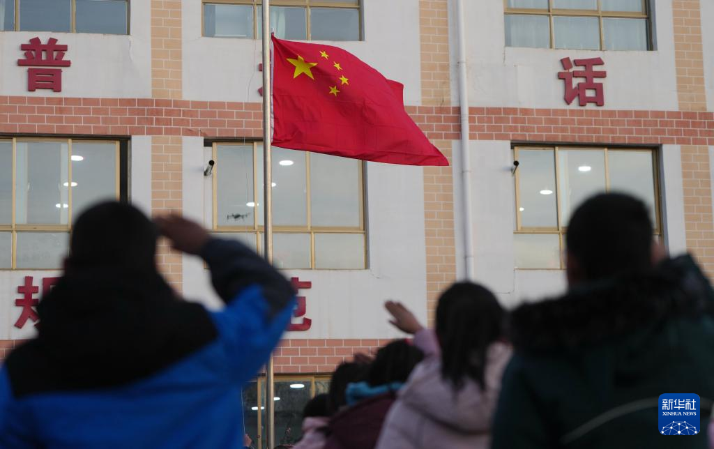 25日、積石山パオアン族トンシャン族サラール族自治県柳溝郷陽山希望小学校で授業再開初日に国旗掲揚式に参加した児童ら。(積石山=新華社記者/陳斌)