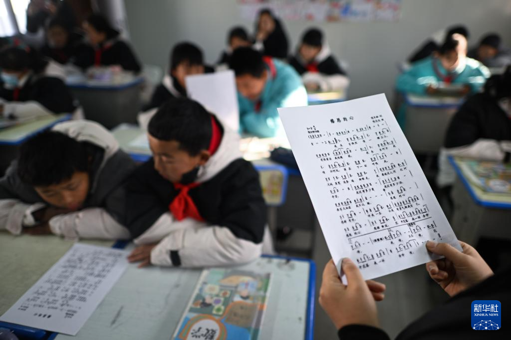 2日、海東市民和回族トゥ族自治県の官亭鎮中心学校で、音楽の授業を受ける生徒ら。(海東=新華社記者/張竜)