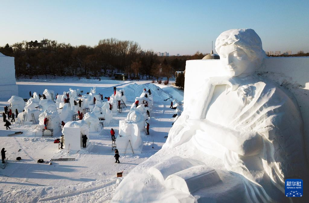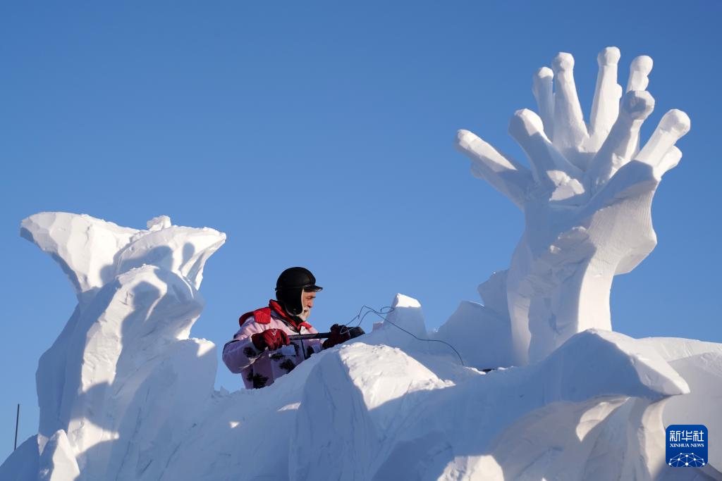 【新華社ハルビン1月8日】中国黒竜江省ハルビン市の太陽島雪像芸術博覧会パークでは6~9日、第26回中国・ハルビン国際雪像彫刻コンテストが開かれている。厳寒の中、12カ国から集まった参加者が繊細な仕上げ作業を続けている。pagebreak