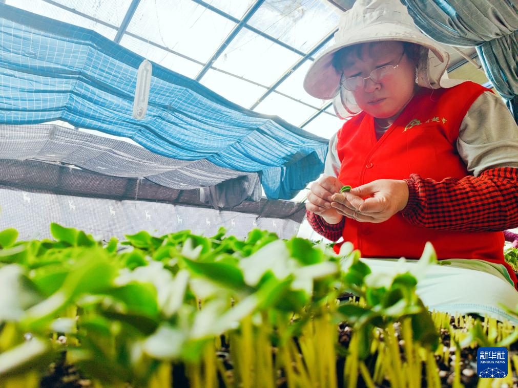 15日、黒竜江緑旺蔬菜の育苗工場で接ぎ木作業を行う従業員。(ハルビン=新華社配信)