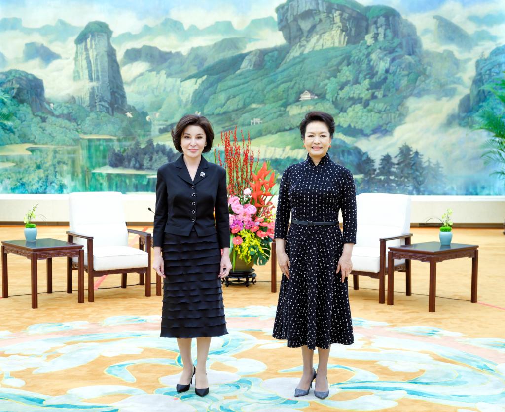 24日、記念撮影に応じる彭麗媛氏(右)とミルジヨエワ氏。(北京=新華社記者/丁林)