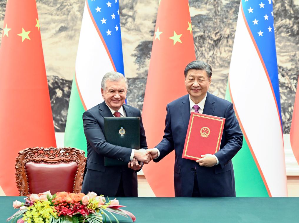 24日、会談後、両国の「新時代の全天候型全面的戦略パートナーシップ」に関する共同声明に署名し、握手を交わす習近平主席(右)とミルジヨエフ大統領。(北京=新華社記者/殷博古)