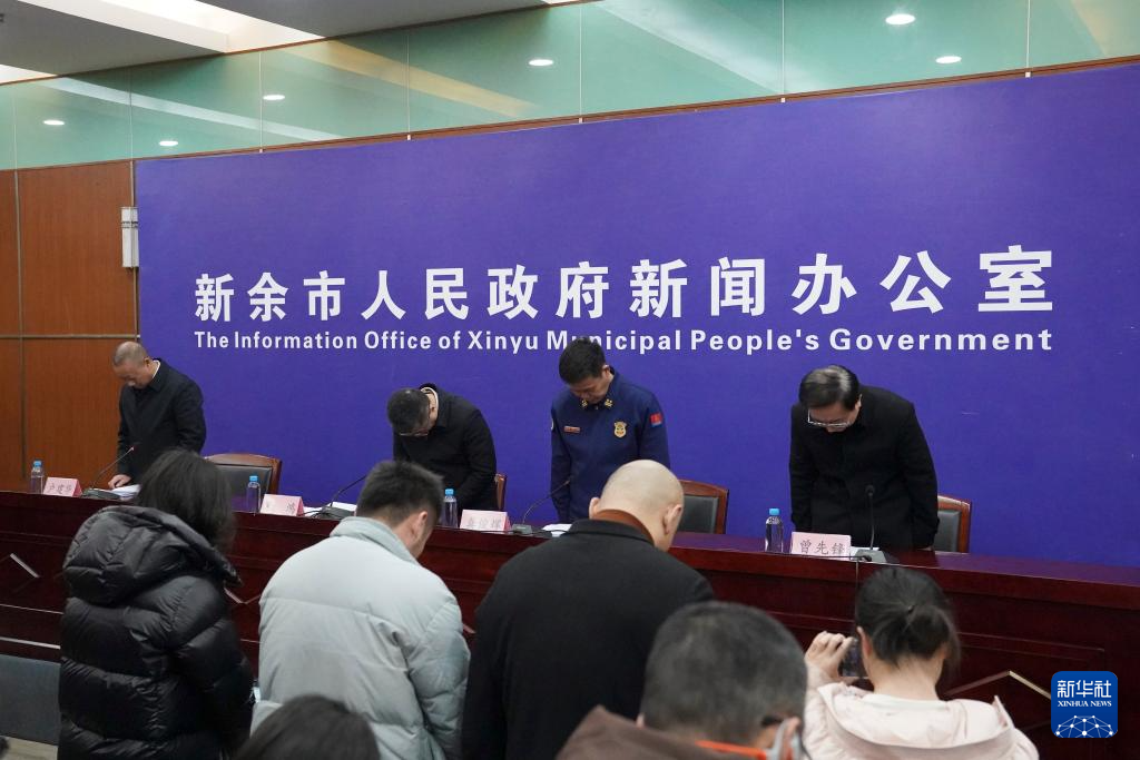 25日、記者会見に先立ち、火災の犠牲者に哀悼の意を表す出席者ら。(新余=新華社記者/周密)