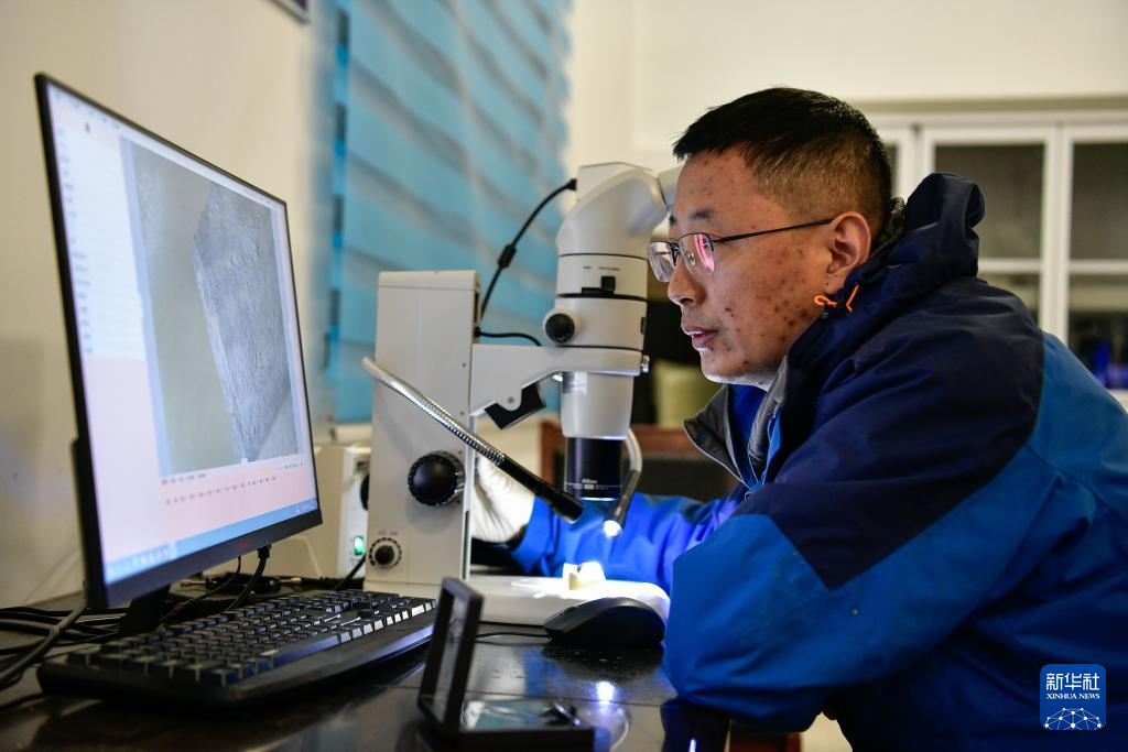 24日、貴州省文物考古研究所穿洞作業ステーションで、穿洞遺跡で出土した考古学標本を顕微鏡で観察する同研究所の張興竜(ちょう・こうりゅう)副所長。(普定=新華社記者/楊文斌)